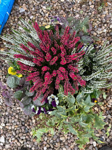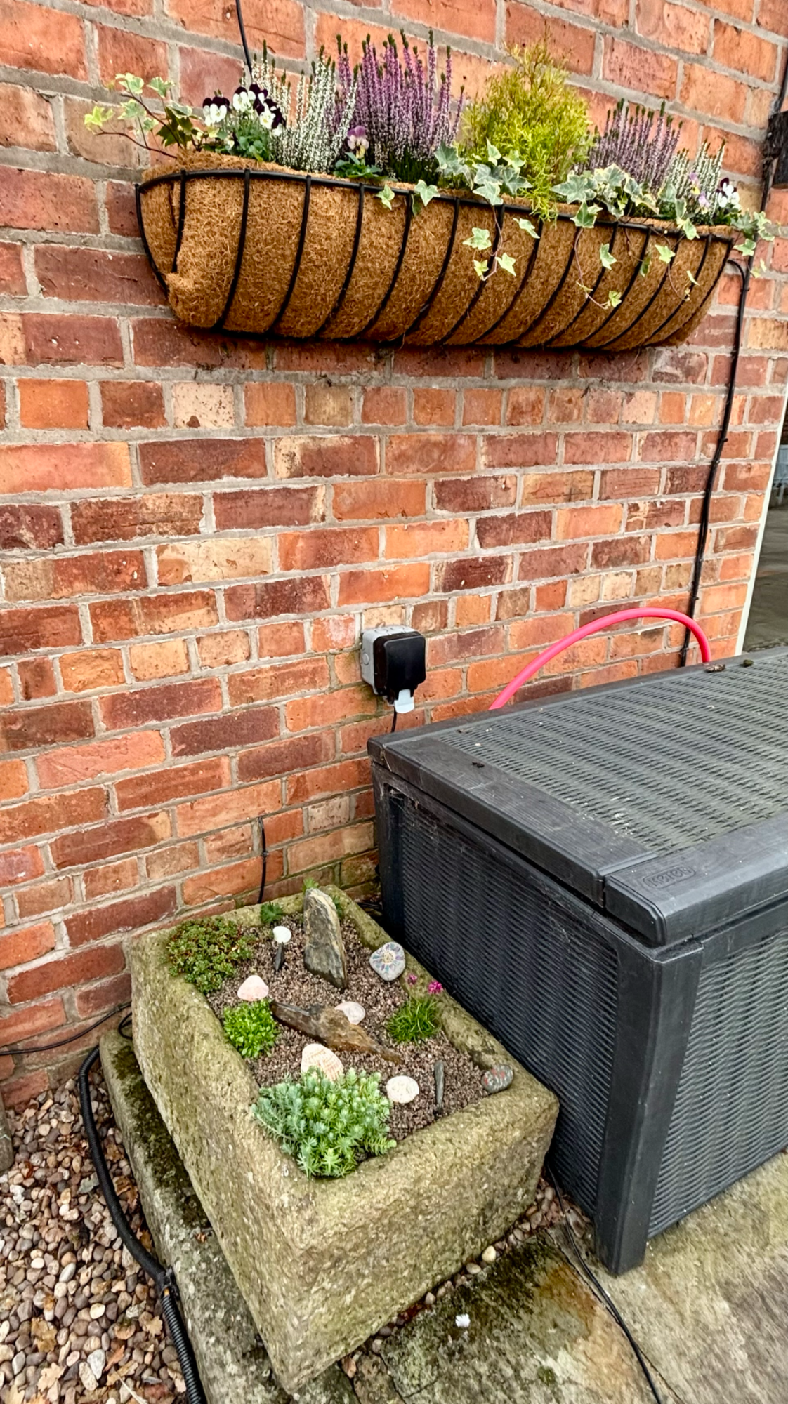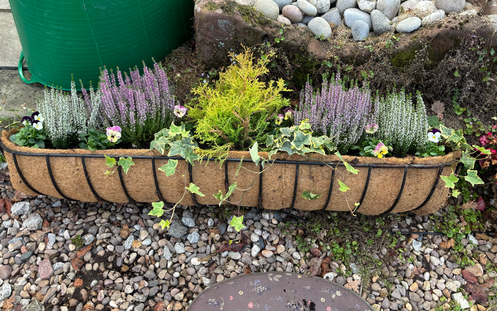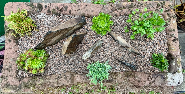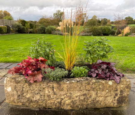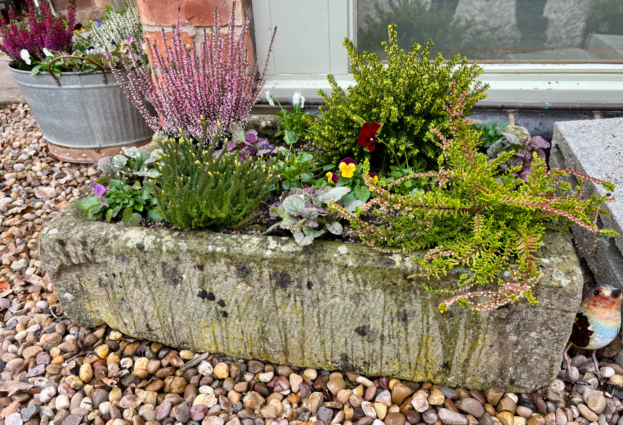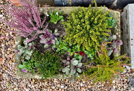 Wall troughs, a hanging basket, containers and a stone planter had annual plants replaced with heathers, violas, a small conifer and Ajuga with ivy to trail down. Stone planters on the patio were planted with alpine plants with slate pieces set into the compost. Larger stone planters on the patio were planted with perennials including grasses, heuchera, bee-friendly flowering plants and alpines.