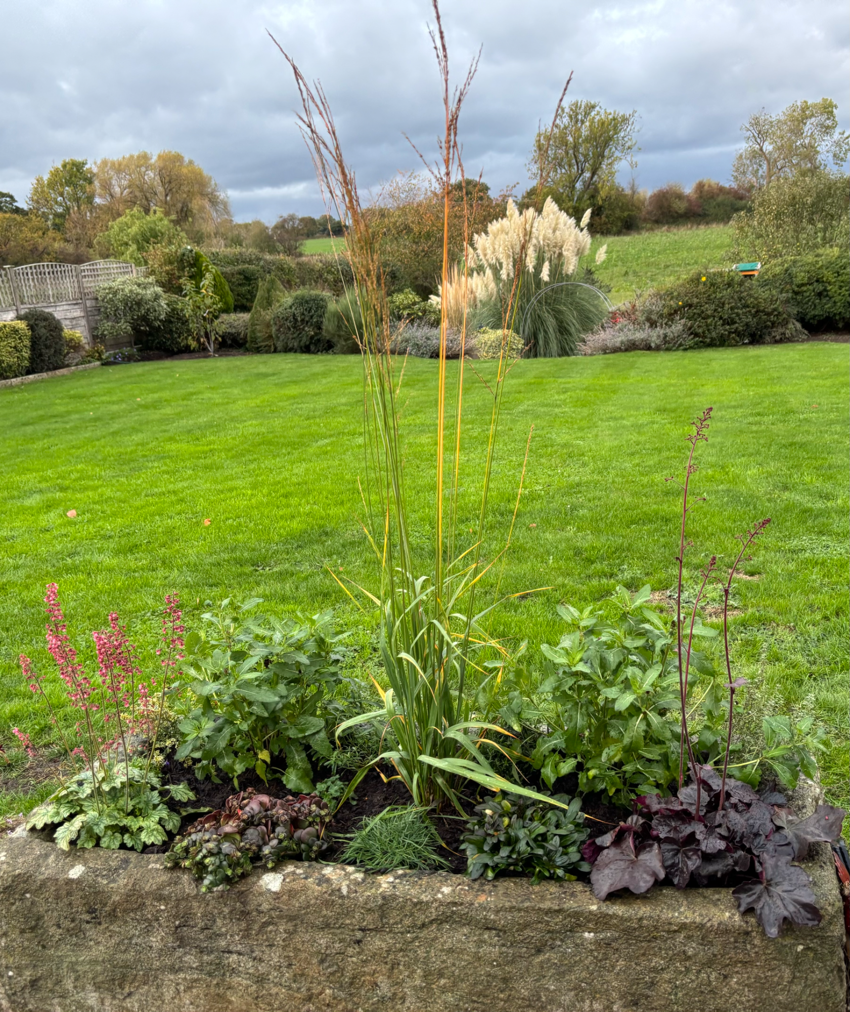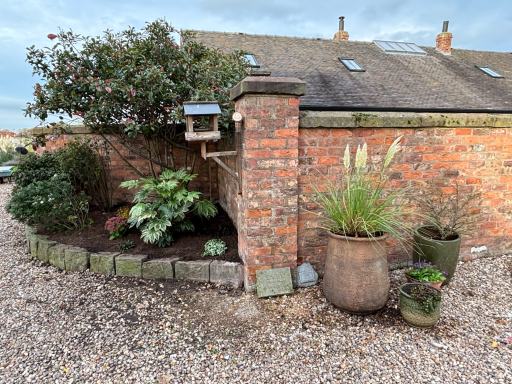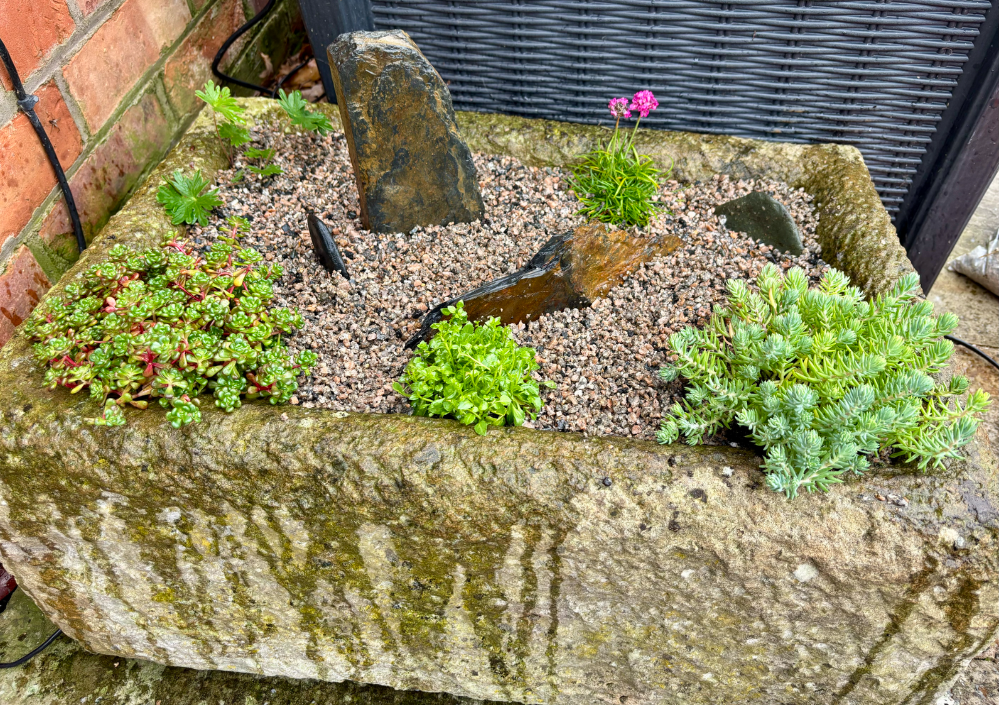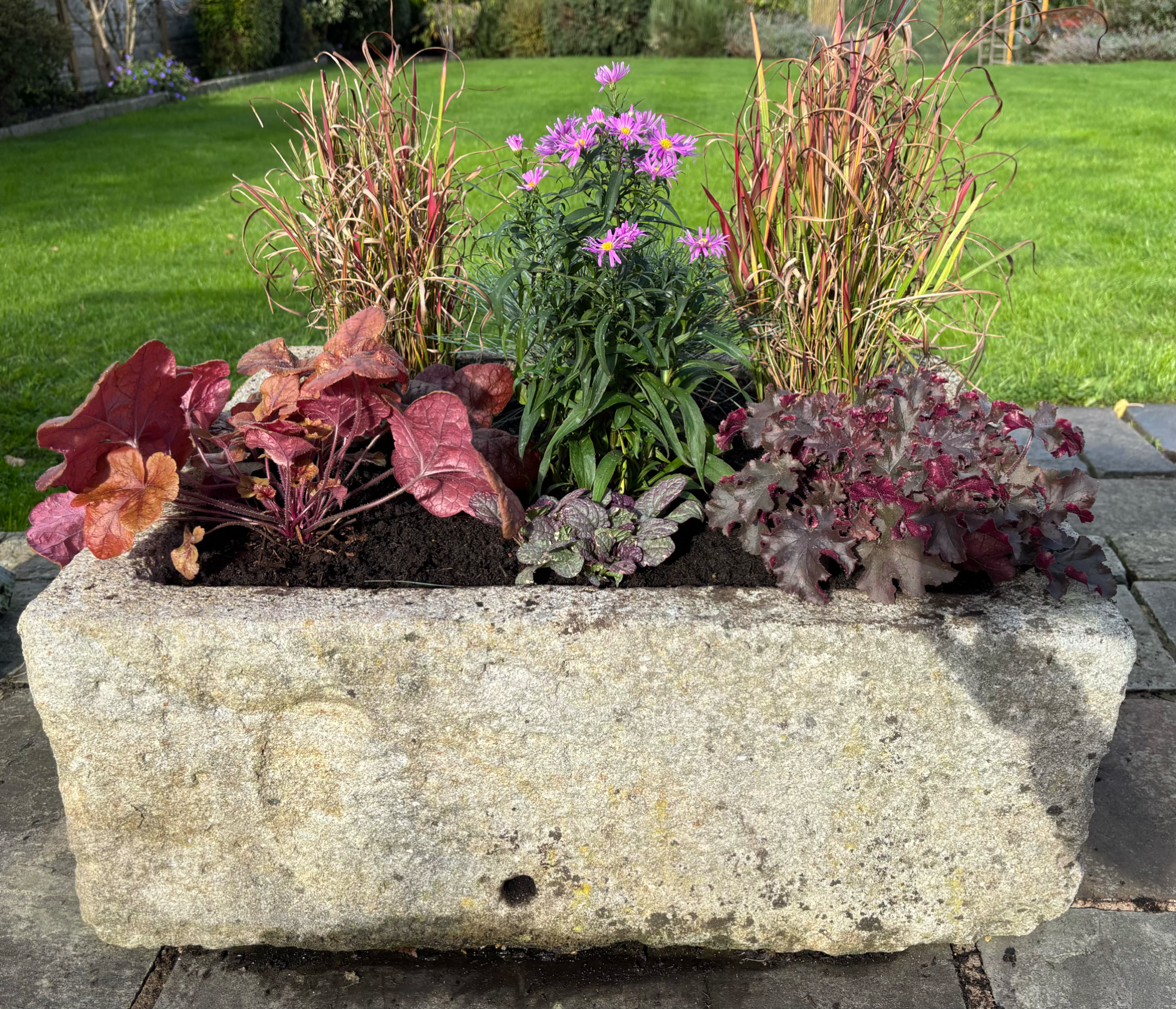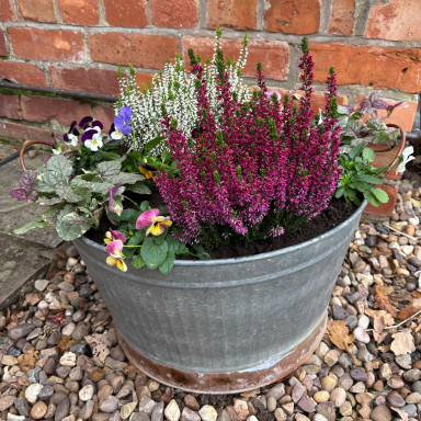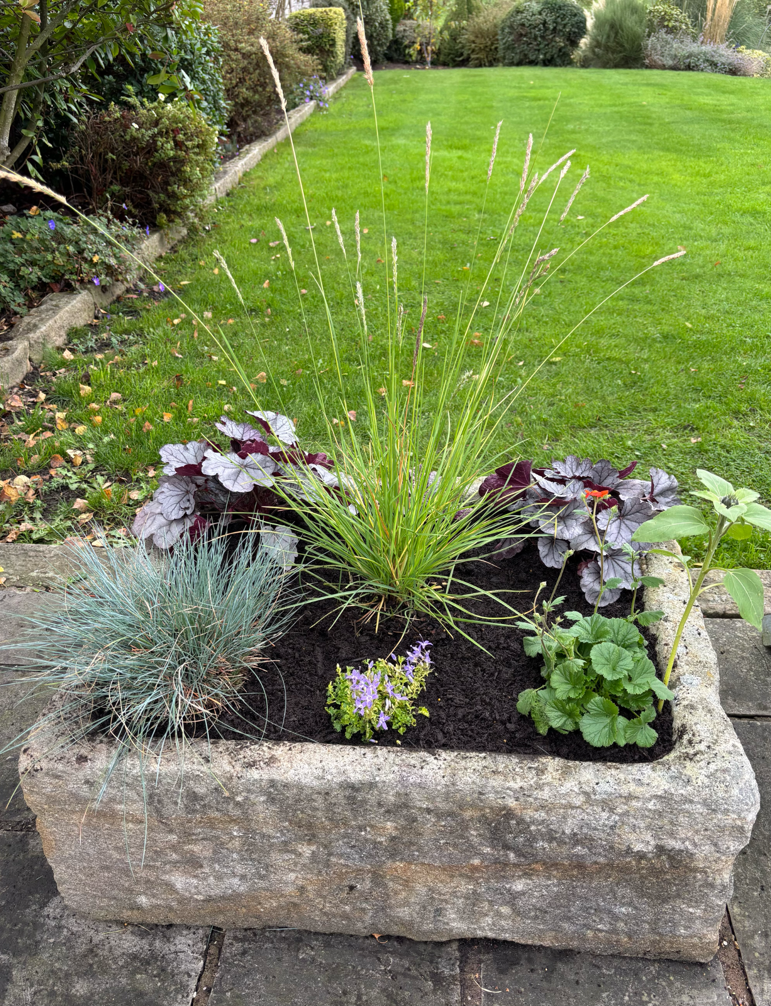 Wall troughs, a hanging basket, containers and a stone planter had annual plants replaced with heathers, violas, a small conifer and Ajuga with ivy to trail down. Stone planters on the patio were planted with alpine plants with slate pieces set into the compost. Larger stone planters on the patio were planted with perennials including grasses, heuchera, bee-friendly flowering plants and alpines.