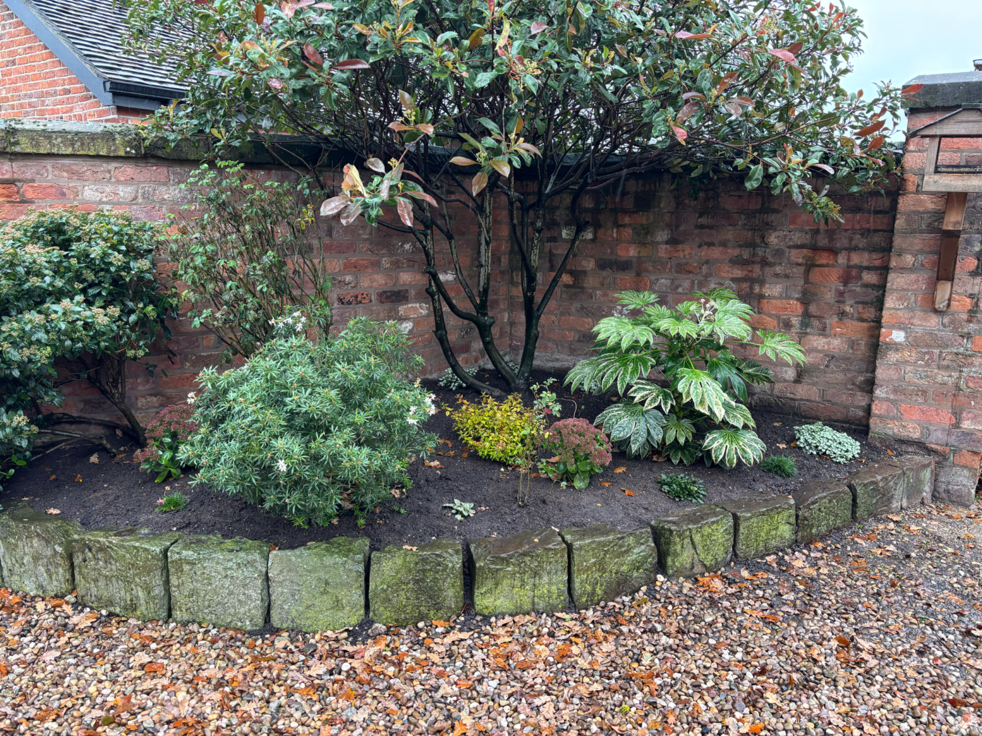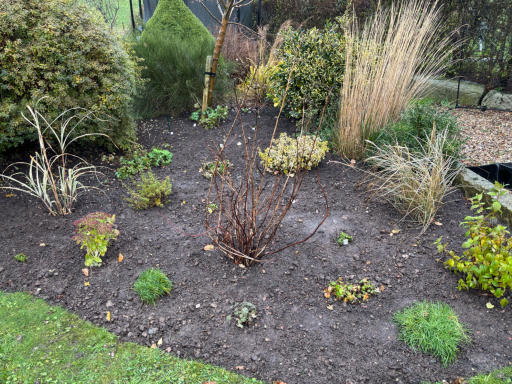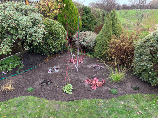 A design and planting plan was created for a front garden border to create a beautiful, low maintenance and wildlife-friendly space. The area was cleared of weeds. Plants for acidic soil were sourced and planted by Emma. A small pond was added and the area mulched to keep down the weeds. More flowering perennials will be added in the Spring.
