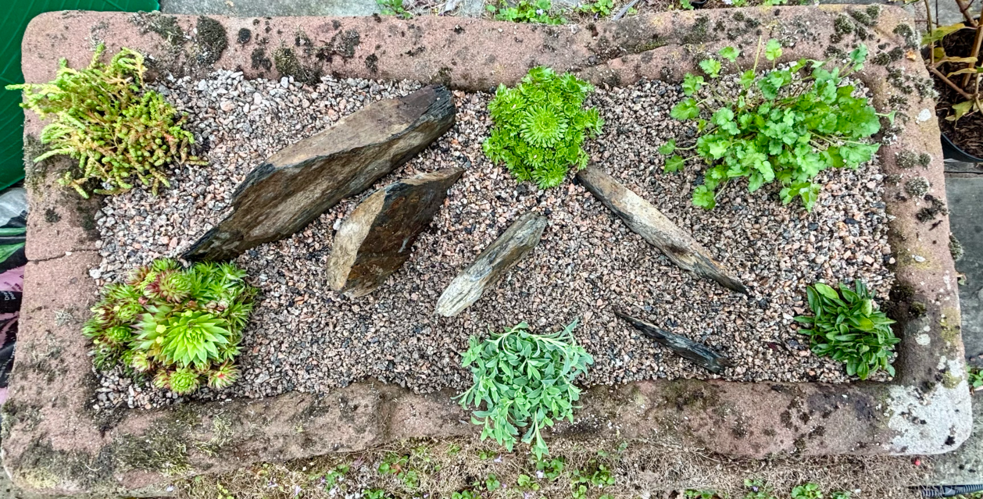 An overgrown area was cleared of weeds. Topsoil was added along with large pieces of rustic slate . Alpine plants including sedums, Armeria and Helianthemum were planted along with ivy and a Mugo pine. Blue slate pieces and cobble stones were used to mulch the area.